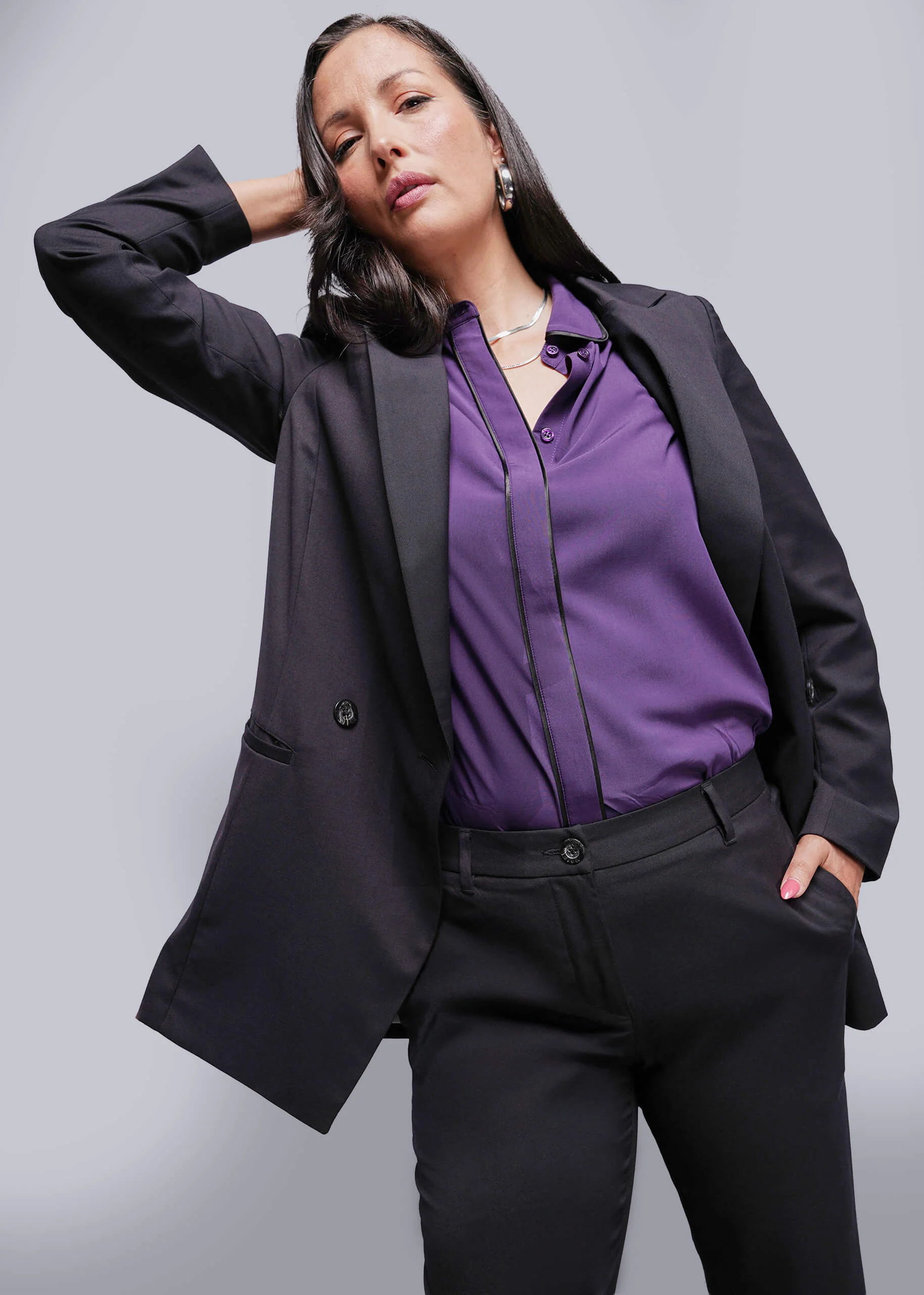 This timeless long-line blazer is the perfect combination of tailored and oversized. Featuring a soft, stretchy, breathable material and silky lining, this blazer fits true to size. Size up for a more relaxed fit.