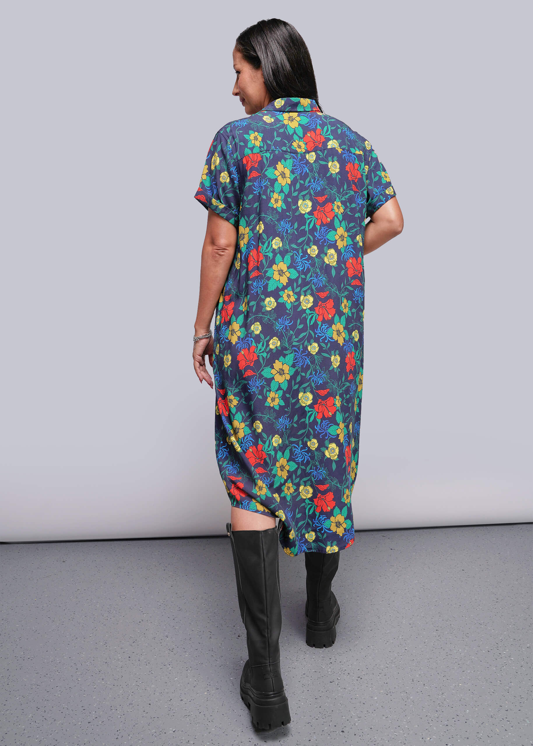 Easy breezy, one piece dressing. This soft and flowy shirt dress features a midi-length and a button closure to wear as a dress or style unbuttoned as a lightweight layer.