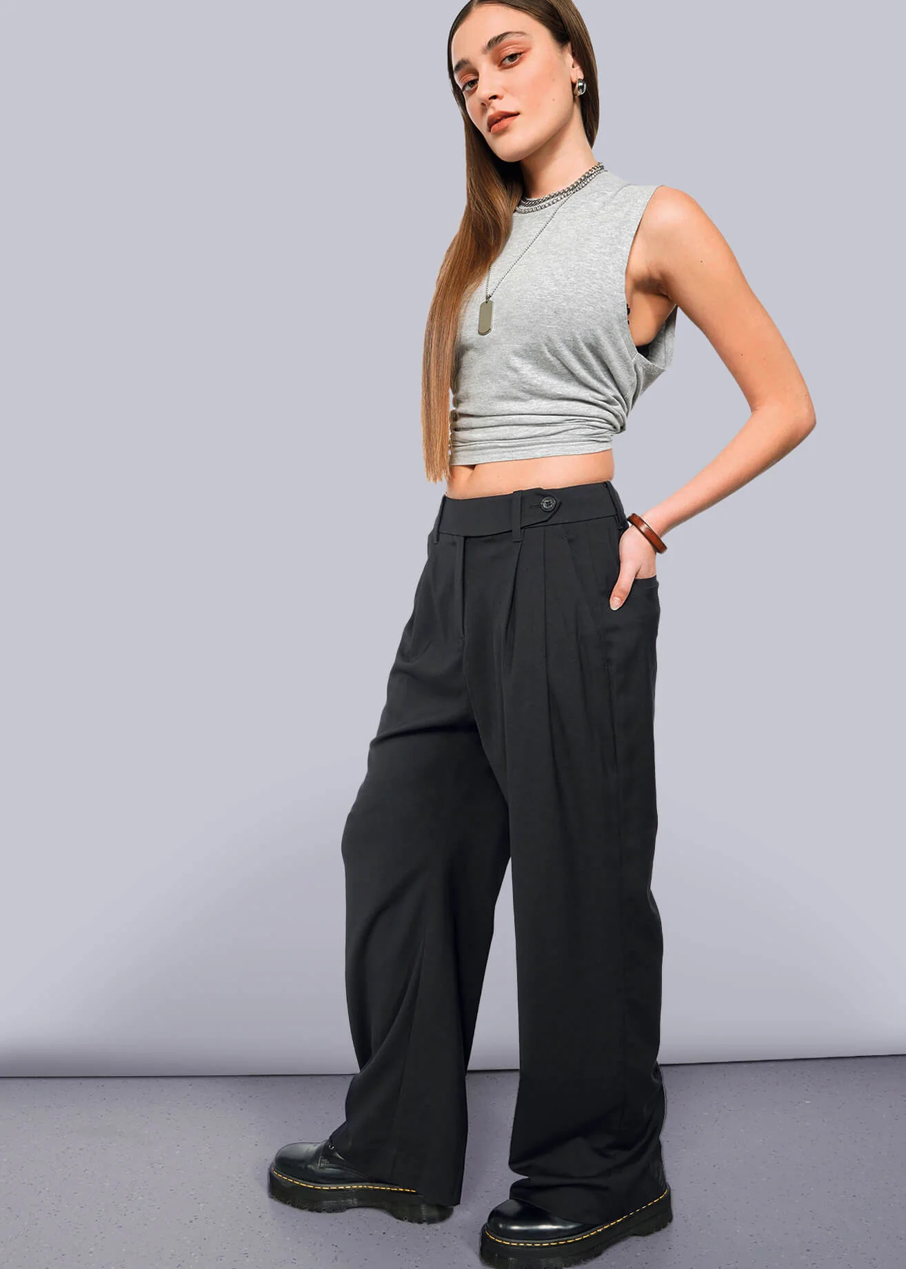 With a high waisted fit, tab front closure, and double front pleats, this long line loose leg trouser is the perfect mix of flowy and tailored.