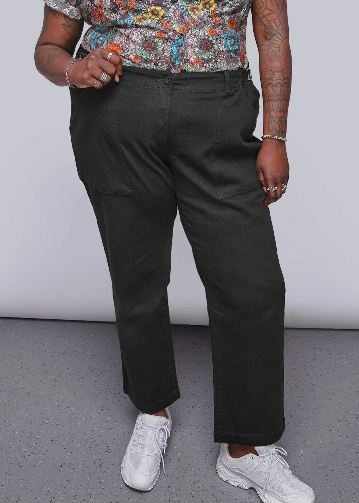 Relaxed mid rise fit. Adjustable waist.