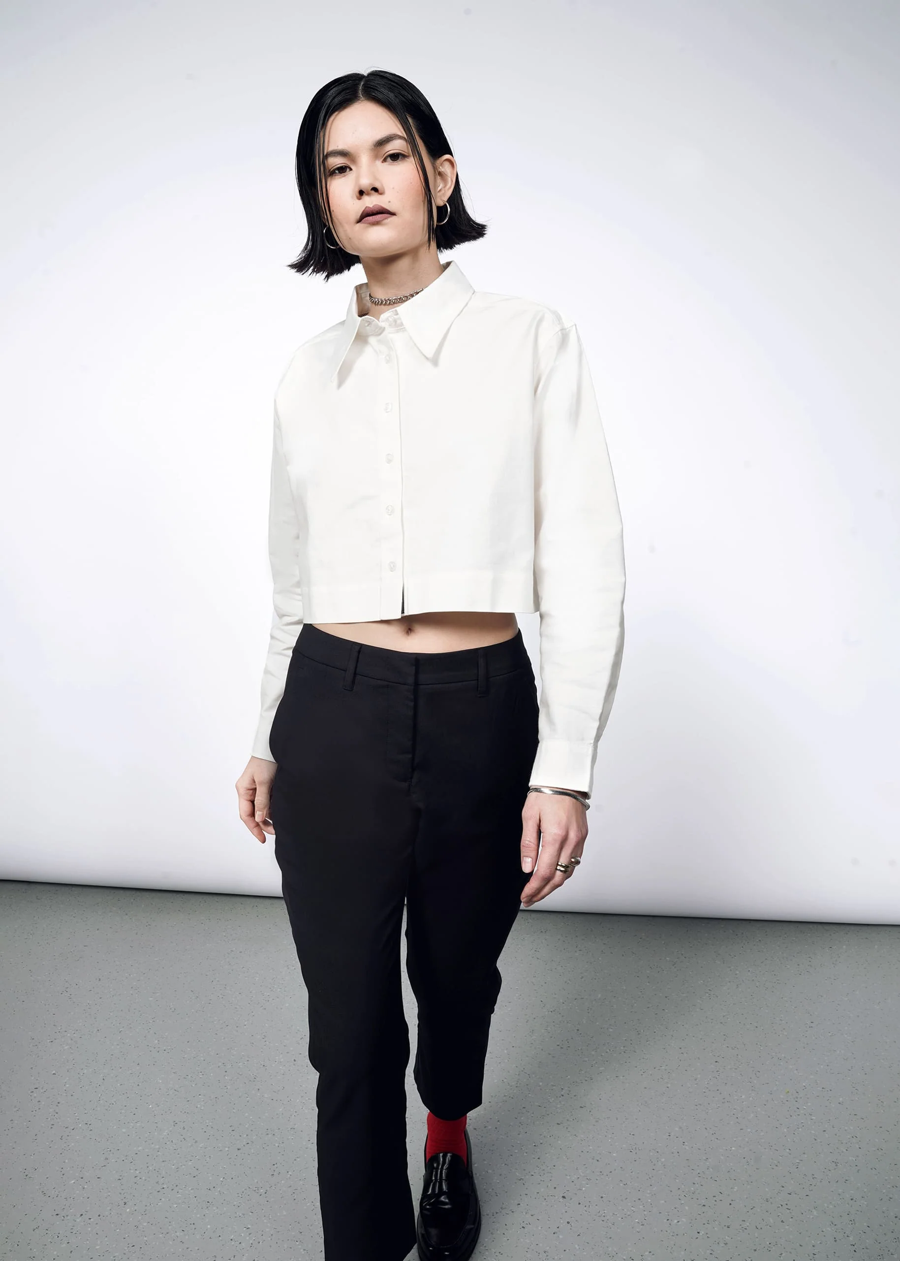 The crisp, classic oxford button up - now in a cropped silhouette. In a soft, breathable cotton, this button-up has an oversized fit and pairs well with a high waisted bottom, under our overalls, or layered under the Convertible Blazer for a cropped formal look.